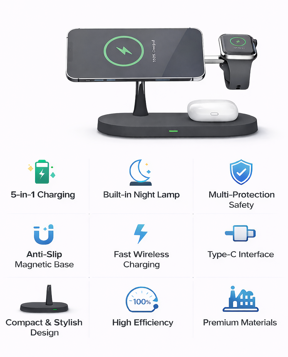 5-in-1 Magnetic Wireless Charger – 15W Phone, Watch & Headset